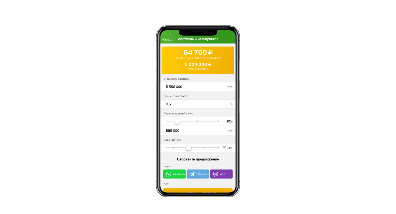 Если нужно быстро рассчитать размер ипотечных платежей, достаточно указать стоимость квартиры, процентную ставку и размер первоначального взноса. В реальном времени рассчитывается размер ежемесячного платежа и сумма ипотеки. Получившимися расчетами риелтор может в один клик поделиться с клиентом в мессенджере.