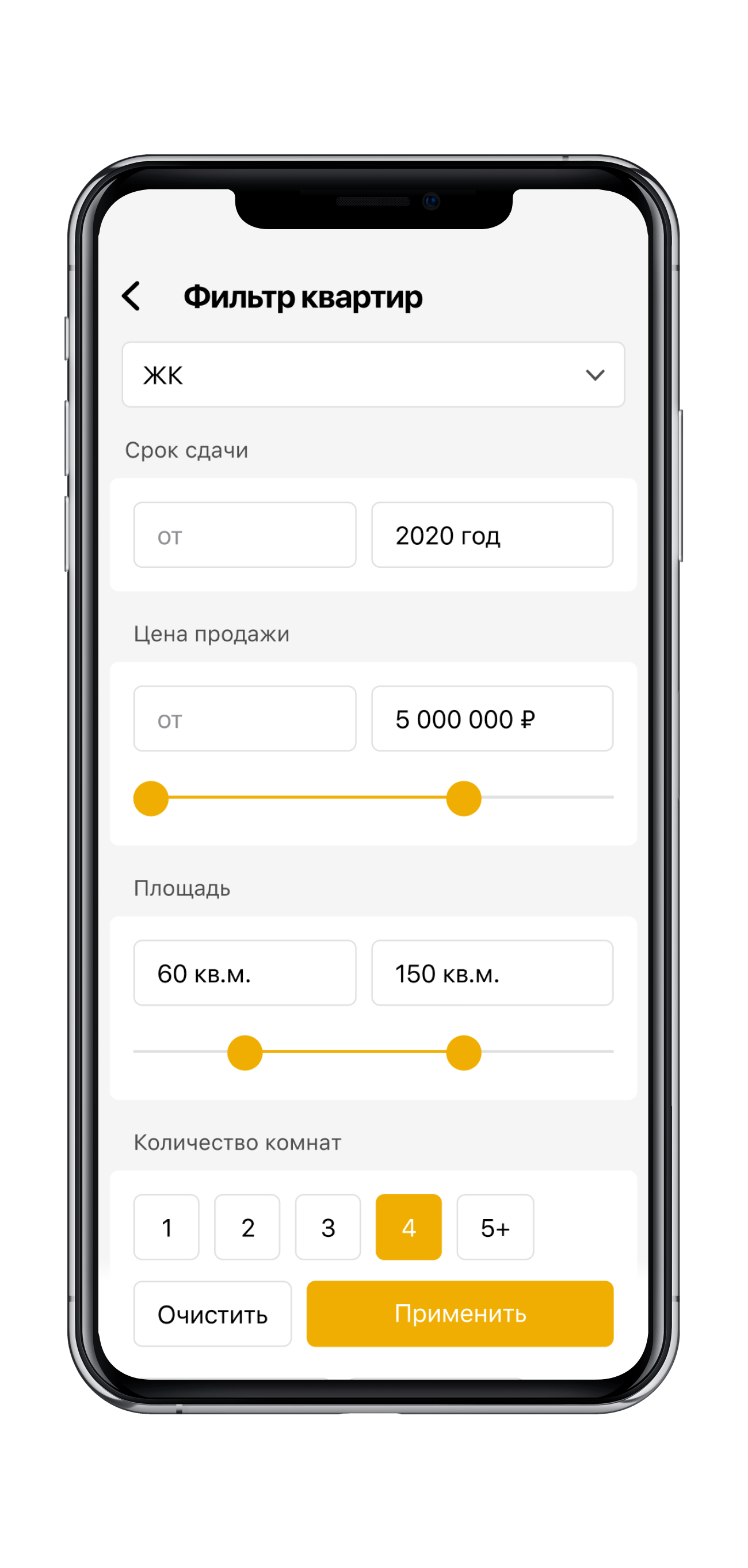 Чтобы сузить область поиска квартиры мечты, в приложении есть фильтр по разным параметрам: по жилому комплексу, типу недвижимости, сроку сдачи, границам стоимости, площади, количеству комнат, этажу, наличию отделки и т.д. Выбранные параметры фильтра не сбрасываются, когда переходишь к другим объектам, — это отдельный небольшой, но очень приятный нюанс.