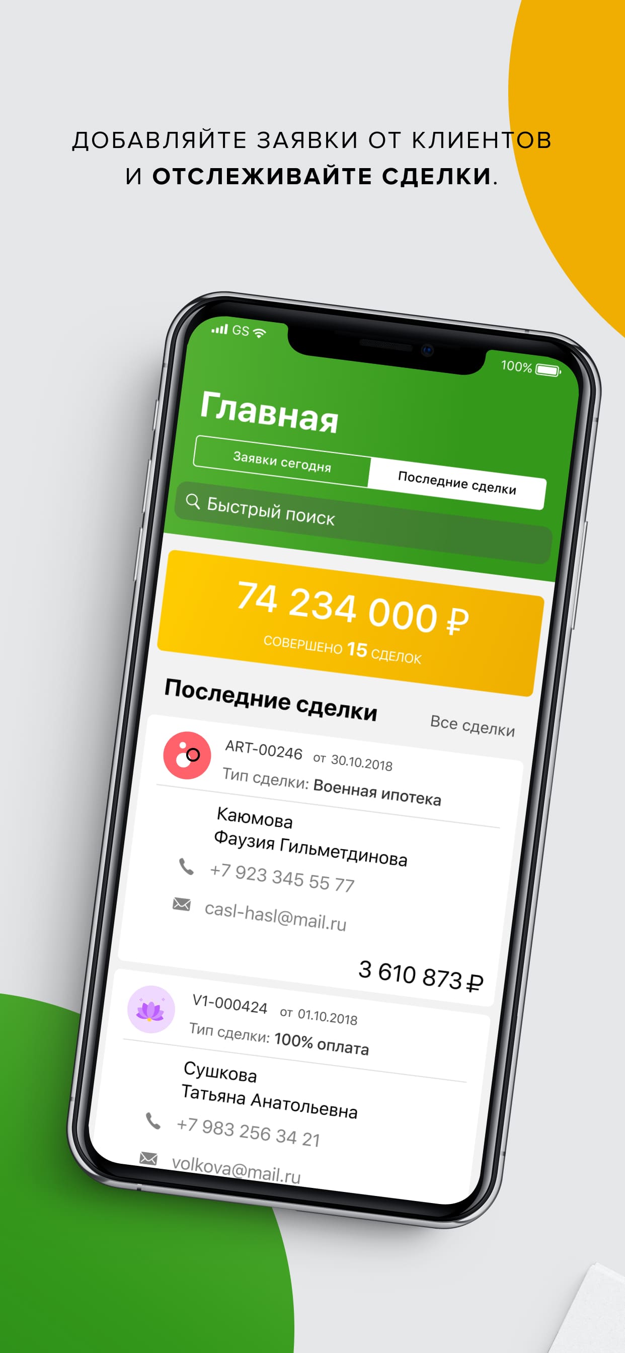 На главной странице приложения выводится информация о текущих заявках риелтора, сумма сделок за текущий месяц и несколько последних закрытых сделок. Можно быстро найти нужную заявку или сделку, перейти к их полному списку.