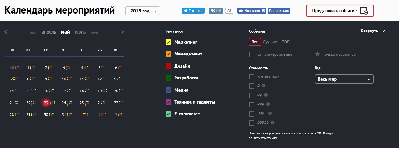Календарь мероприятий Тэглайн — это самый полный и актуальный русскоязычный календарь мероприятий для специалистов digital-рынка. В нем есть все, что вам стоит знать о digital-событиях в России и вне ее. База мероприятий ежедневно обновляется редакторами Тэглайна.