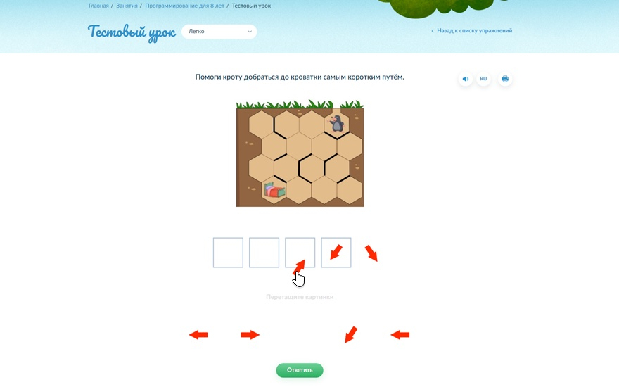 Каждый из них озвучен профессиональным диктором на русском и английском языках. Чтобы ответить, ребенку нужно выбрать один или несколько вариантов — или перетащить картинку. В конце теста его ждет оценка с точным количеством правильных и неправильных ответов.
