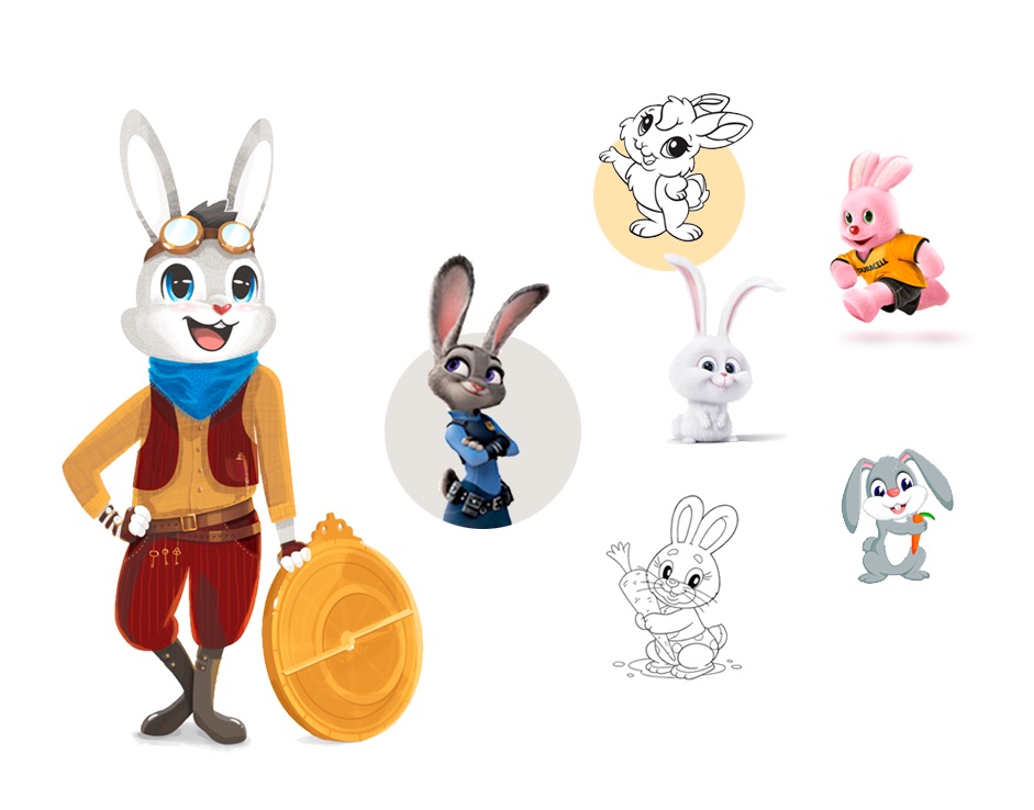 Отдельный этап работы мы посвятили персонажу, ведь он должен стать конкурентным преимуществом сервиса и заинтересовать маленьких пользователей. В итоге решили, что Тилли — это милый заяц. Чтобы создать такого, провели отдельный ресерч. После ряда вариаций мы остановились на этом миляге со стимпанковскими очками и астролябией.