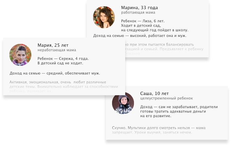 Мы проанализировали целевую аудиторию и составили портреты персон: подробно описали детей, уровень дохода, характер и проблемы каждого — а также то, какие функции сайта могут эти проблемы решить.