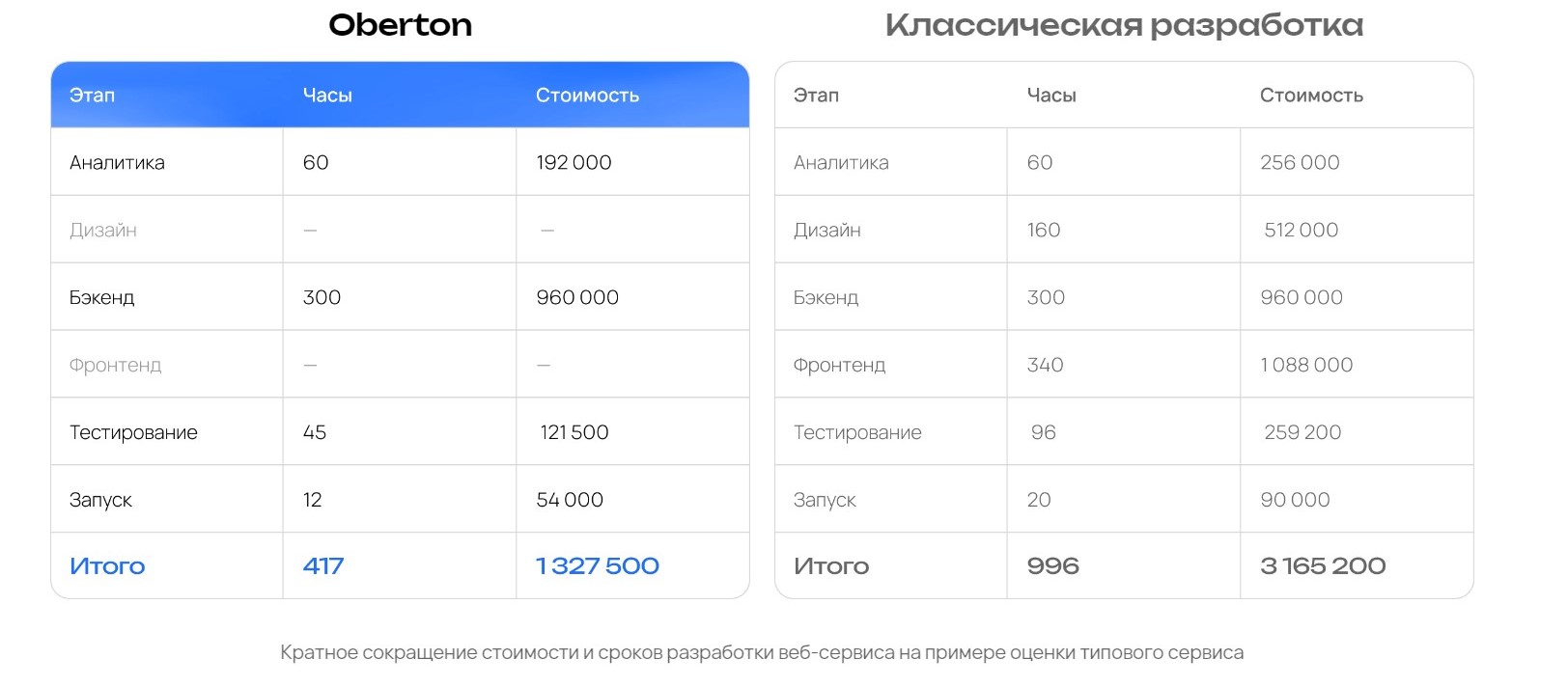 Oberton — наша собственная платформа для low-code разработки, которая позволяет экономить десятки миллионов рублей на создании продукта. На её базе можно разработать любой веб-сервис. Стоимость проекта от 0.6 млн.