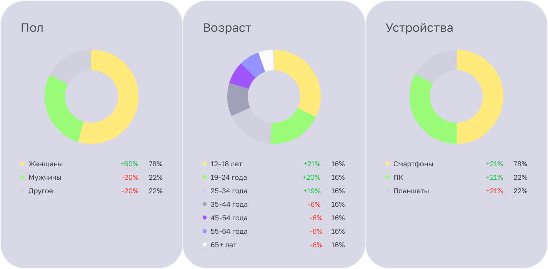 Вывели круговые диаграммы с данными о подписчиках: пол, возраст, устройство, с которого он сидит.