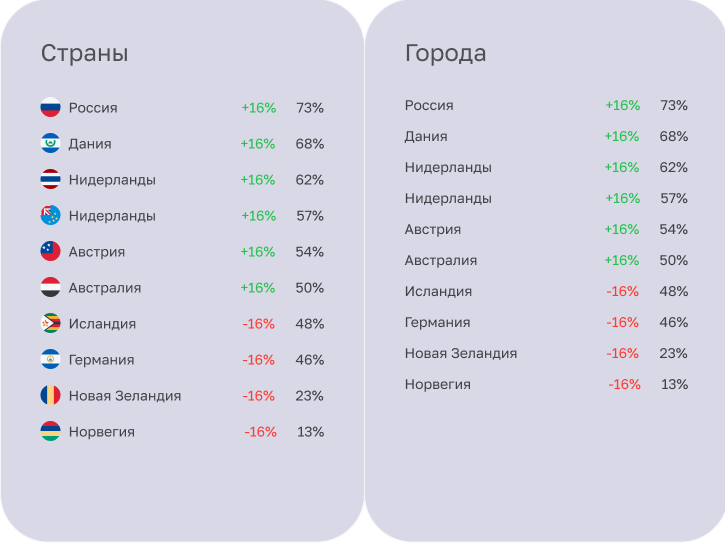 Добавили информацию по странам и городам. Она можно немного отличаться в разных социальных сетях (например, какая-то из соц.сетей не отдаёт информацию о городах, а только о странах). Выводим те данные из соцсетей, которые она отдаёт по API.