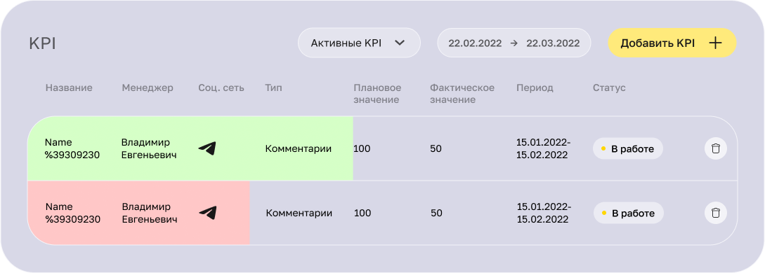 К KPI можно привязать конкретную соцсеть с её показателями заказов и менеджера, на которого данный KPI назначается.