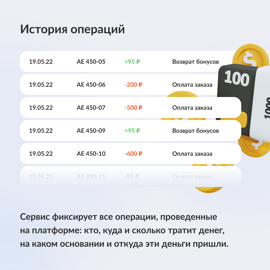 Сервис фиксирует все операции, проведенные на платформе: кто, куда и сколько тратил денег, на каком основании и откуда эти деньги пришли.